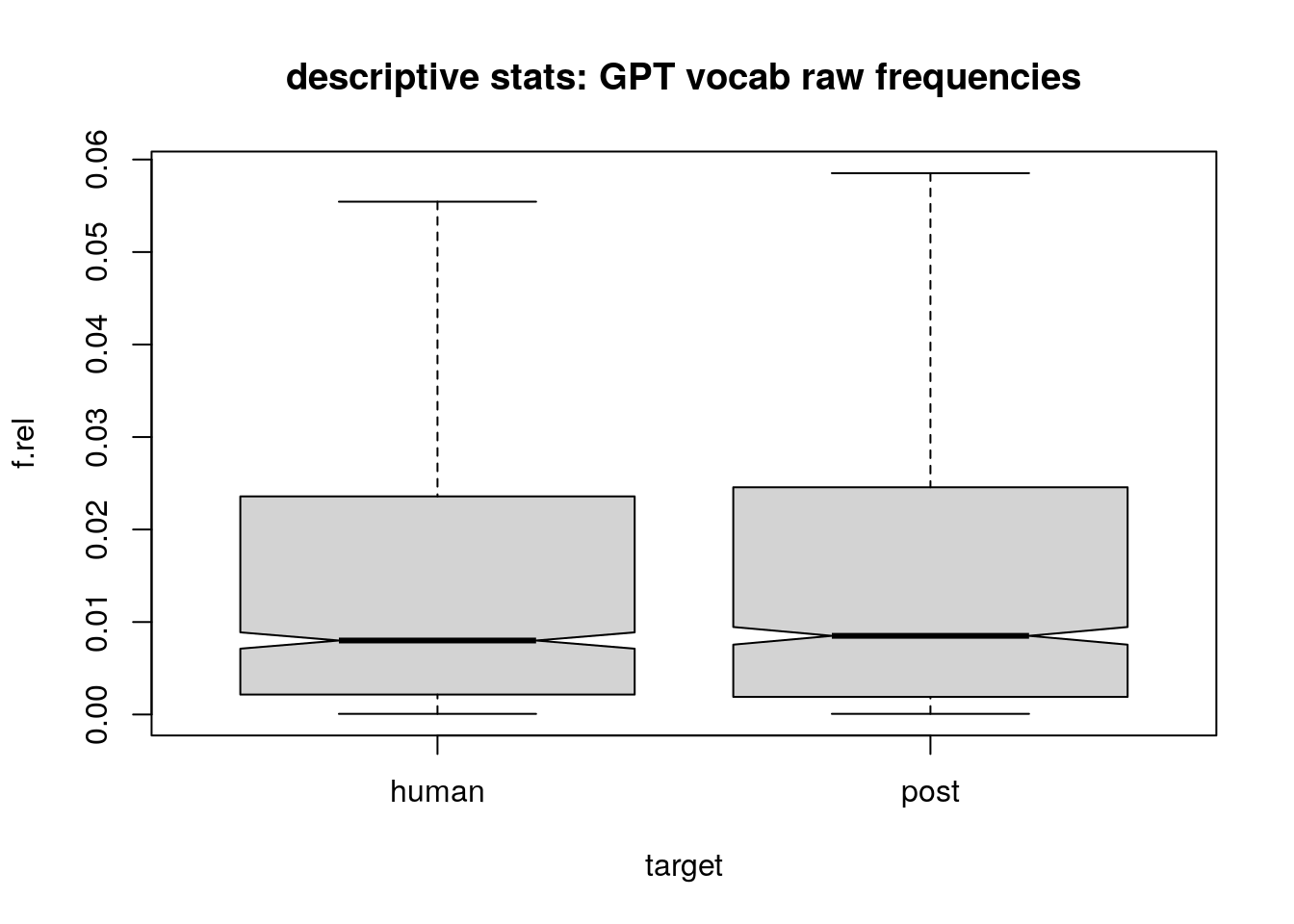 to prove descriptive results, we compute the stability of the frequency increase for target- vs. reference corpus with a linear regression model using R’s lme4::lmer() function, cf. Bates et al. (2015). coefficents are printed below, where frequency are the relative lemma frequencies over corpus; target defines reference resp. target corpus[post-gpt] (human/post) and in.gpt as numerical variable representing the gpt-score of the corresponding lemma i.e. wether it scores high (positive values) or low (negative values) in terms of being preferredly used by the chat agent.