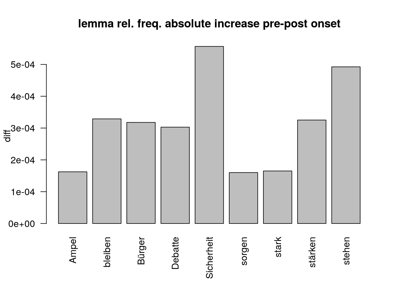 The 9 lemma where 1. the relative frequency of lemma in target=post is higher than in target=pre (n=27) and 2. that frequency exceeds the mean relative frequency is displayed in Figure 3.