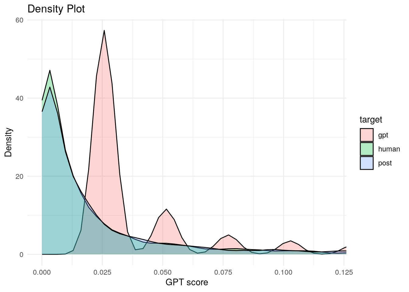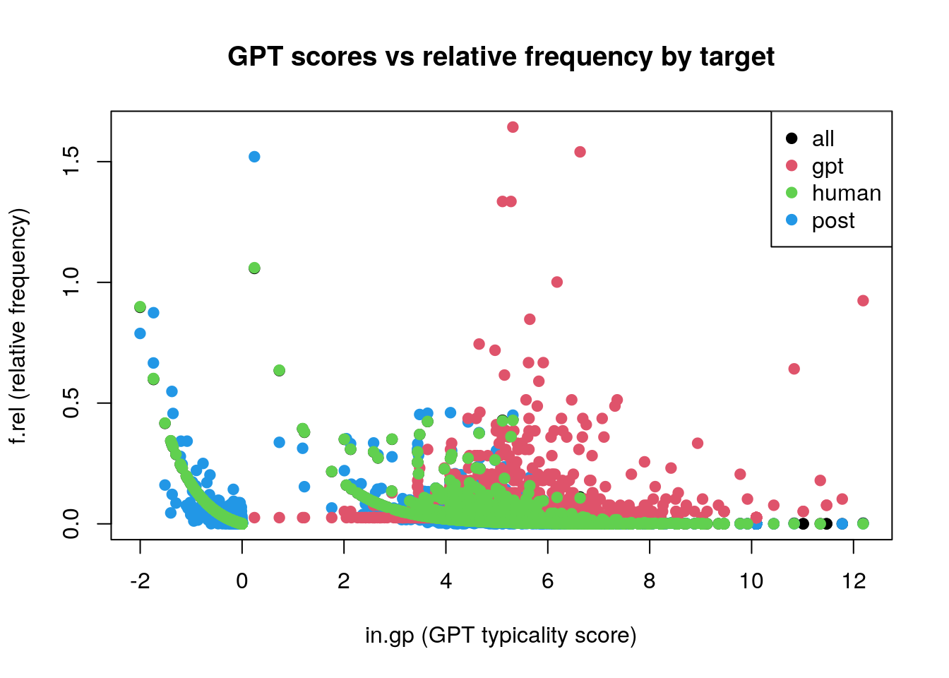 the coefficients interesting for us are the in.gp and targetpost:in.gp estimates. here we test the association between the gpt score of a lemma and its estimated frequency and its showing that a general increase of frequency is estimated if the score rises (=the lemma is within the lemmas preferred used by gemini) and that for the post-gpt corpus this increase (30.25027%) is significant (and not random in data).